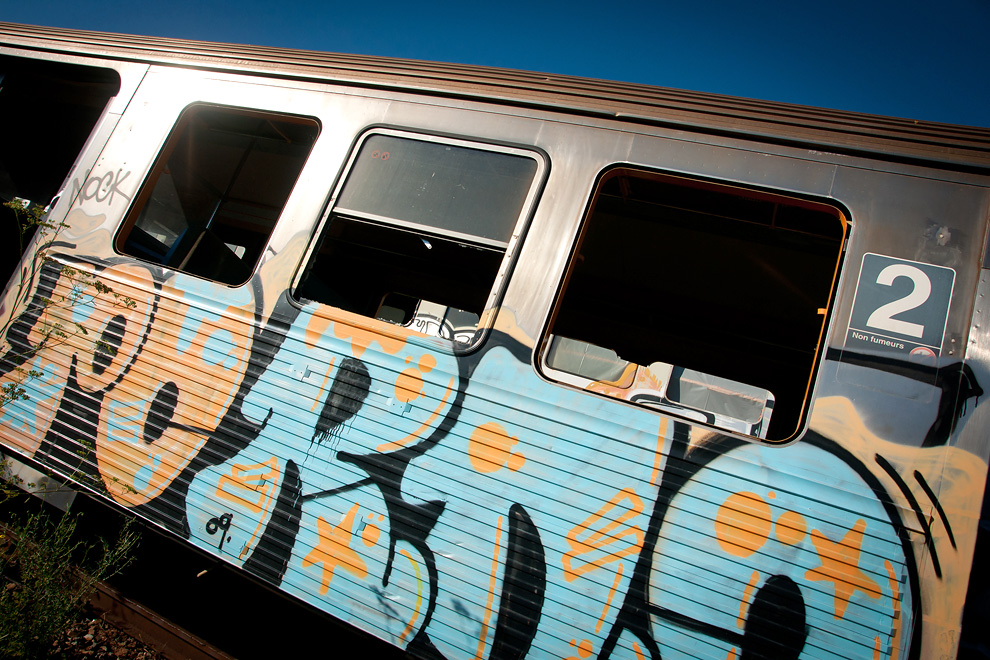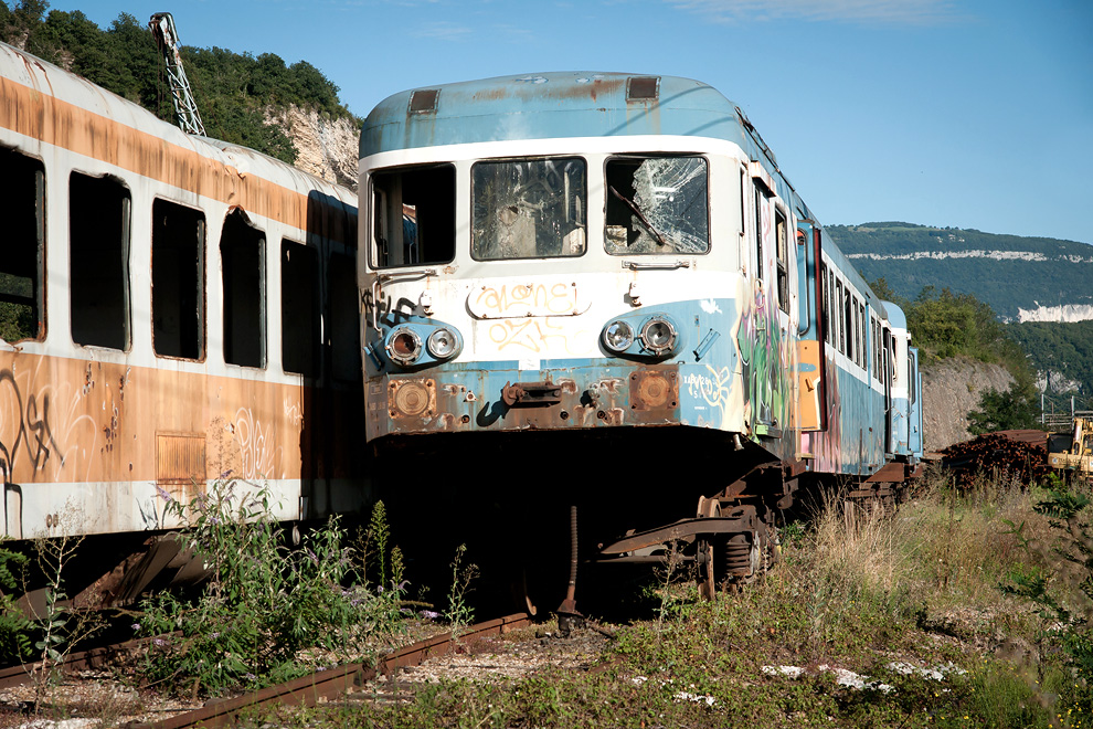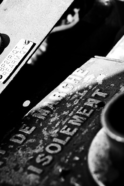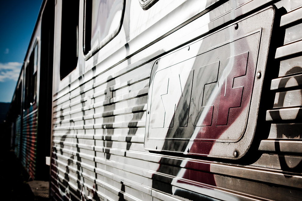 Détour par les sombres lieux de démantèlement de nos anciens trains… Tags et rouille apparaissent de partout, le temps fait son œuvre, mais cet environnement devient propice à quelques essais photographiques sur les ambiances, sur les textures, sur la lumière…